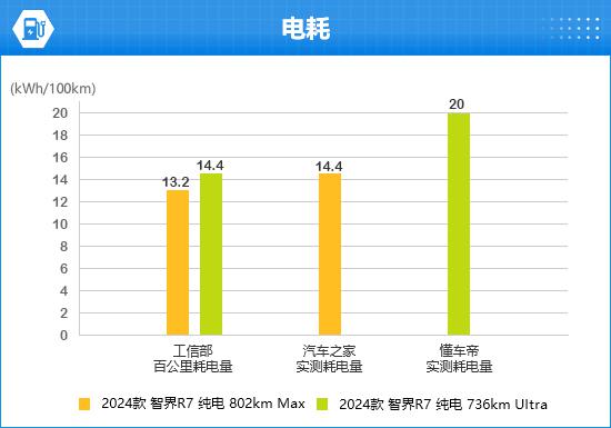 2024根据配置不同, 款智界 R7 工业和信息化部100公里的用电量也有所不同。通过对比两大汽车垂直媒体的实测数据,均高于工业和信息化部。
