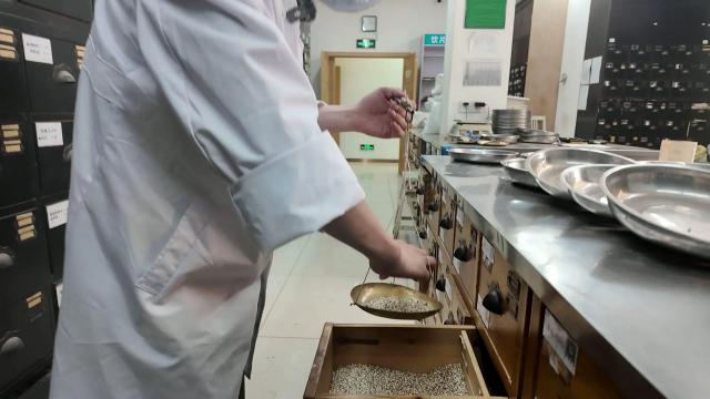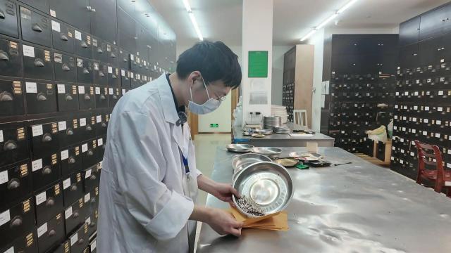 中药师在上海药房德庆堂店的配药室里,在中药柜前寻找几种具有祛湿作用的中药。