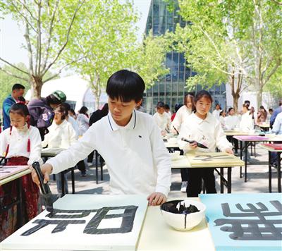昨天,津门少年书法集体撰写活动举行。 三岔日风承古韵 少年大笔写兰亭