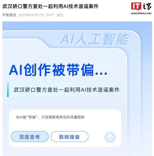 IT 世家 4 月 20 据武汉市公安局报道,近日,武汉市公安局区分局对武汉市公安局进行了严厉查处,并一起使用。 AI 网络谣言的技术编造案例。