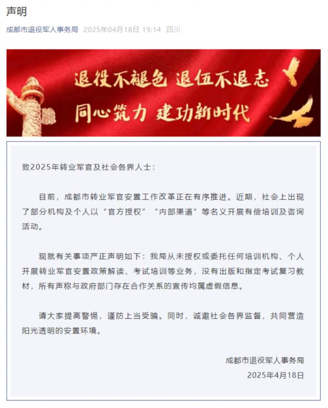 有偿培训,政策咨询,官方委托组织转业安置?成都退役军人事务局:假的!