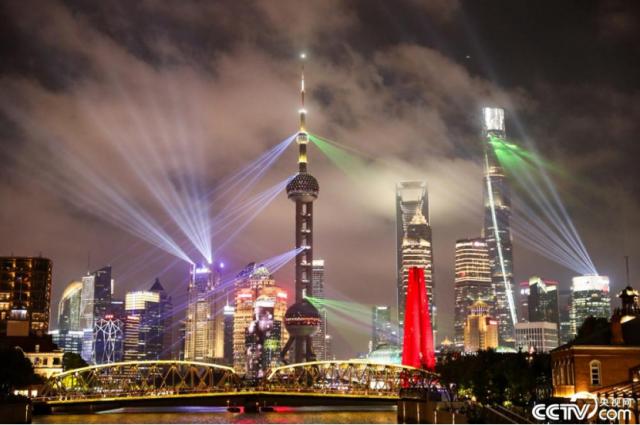 为了庆祝上海浦东开发开放开放 35 周年纪念日,陆家嘴开启了一场美丽的灯光秀主题光影展,18 日晚 7 时间的黄浦江畔璀璨如画。