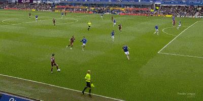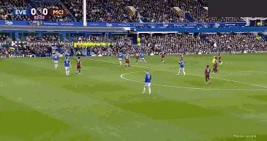 第 30 一分钟,曼城逃过一劫,埃弗顿左路角球开到雷区,塔科夫斯基回头看着门口的月球顶在柱子上弹出。