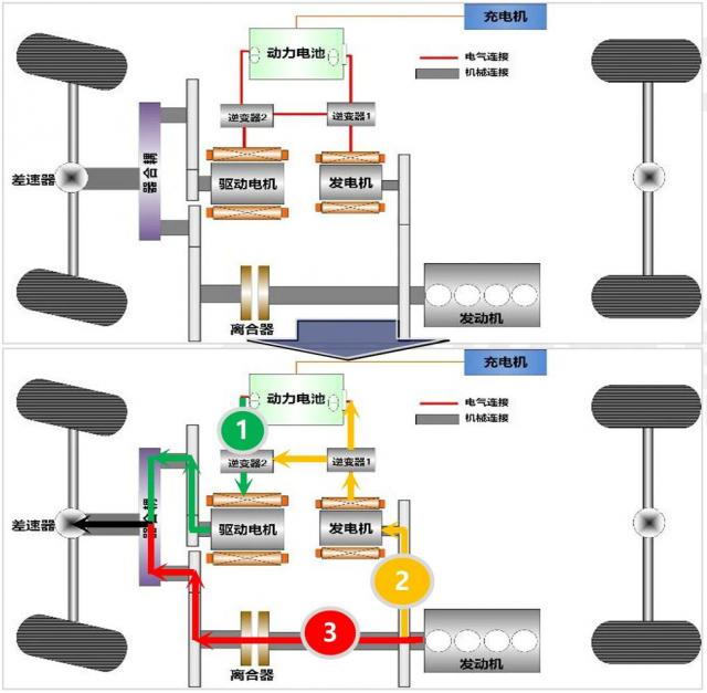 图 | 红旗非常混合动力系统的动态响应逻辑:①纯电工况②中低速增程工况③发动机直接驱动高速工况,中低速车辆加速选择。①②联合模式,高速下超车①③联合