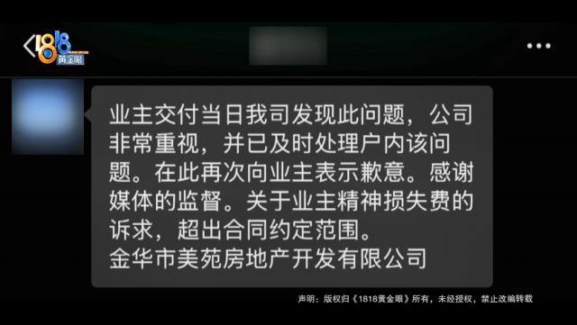 物业经理告诉记者,房子还没有移交给物业,具体情况还是要联系开发商,他留下了记者的联系方式。之后,开发商金华美苑房地产开发有限公司回复记者,业主在交付当天发现了这个问题。企业非常重视,并且及时处理室内问题,再一次向业主道歉。对业主精神损失费用的诉求,超出合同规定的范围。