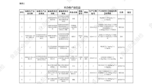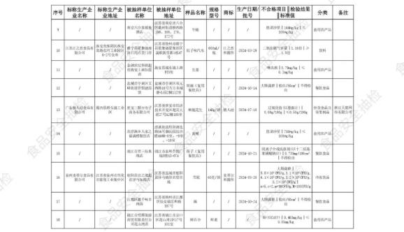 近日,江苏省市场监督管理局组织食品安全抽样,提取饮料、零食、食用农产品、餐饮食品、粮食加工品、炒货食品及坚果制品、肉制品、保健食品、饮料、蔬菜制品、冷冻饮料、冷冻食品、罐头、茶及相关产品、土豆及油炸食品、水产品、淀粉及淀粉制品、水果制品、豆制品、乳制品、食用油、油脂及其制品、食用添加剂、饼干、调味料、糖制品和蛋制品等26种食品。发现食用农产品、餐饮食品、炒货食品和坚果制品、饮料、零食、饮料和冷冻饮料等7种食品的21批样品不合格。具体通知如下: