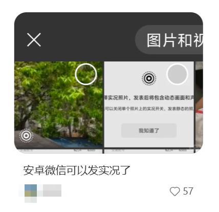 据众多手持Android手机的用户反馈,目前Android版的微信朋友圈,已正式开启实况照片发布的灰度更新。
