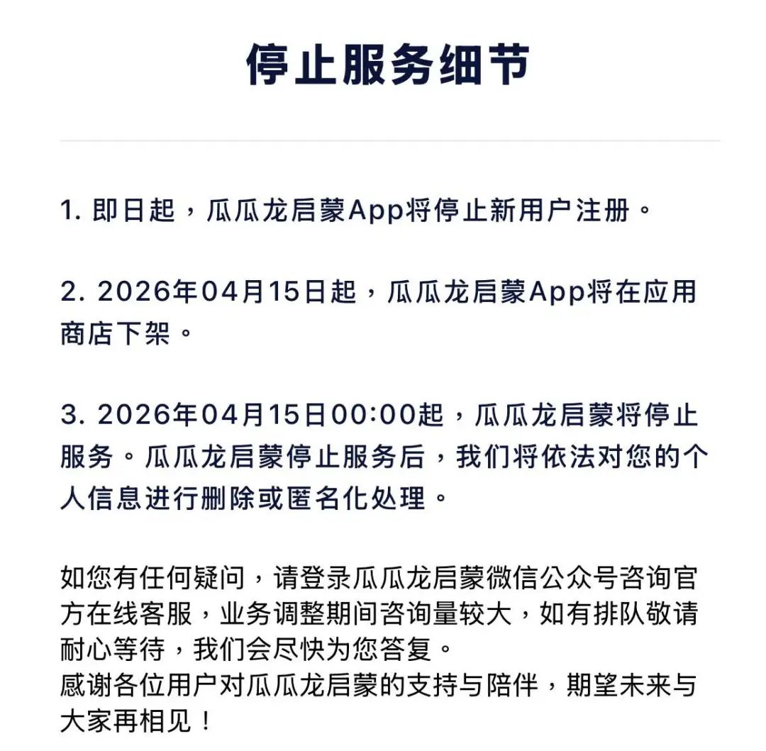 “2026年04月15日00:00起,瓜瓜龙启蒙将停止服务”。
