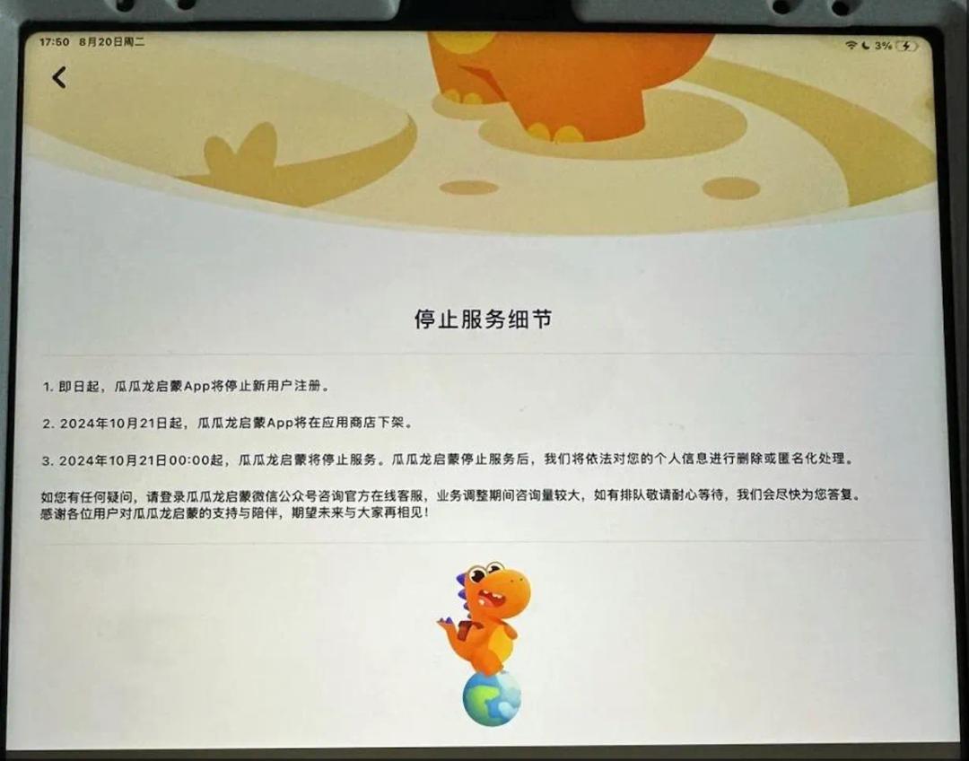直到2024年10月,瓜瓜龙首次向用户推送关闭细节,其中提到App将停止新用户注册,App将从应用商店下架等。
