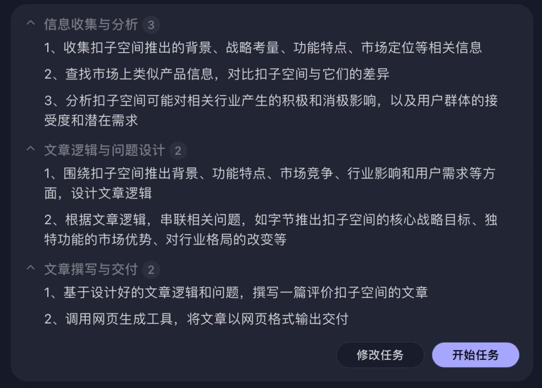 核心能力有三个:任务自动化、专家Agent生态、MCP拓展集成;据说开发者平台将在未来开放,支持开发者向纽扣空间发布应用程序。