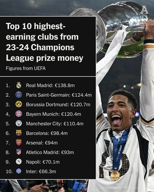 分析:皇马凭借出色的竞技表现,巨大的历史指数奖金,以及市场影响,成为本赛季奖金收入最高的俱乐部。