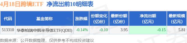 当天有 1 只跨境 ETF 资金净流出,其中华泰柏瑞中韩半导体排名第一。 ETF ( QDII ) (513310),份额下降 1000.0 万份,净流出额为 1454.06 万元。