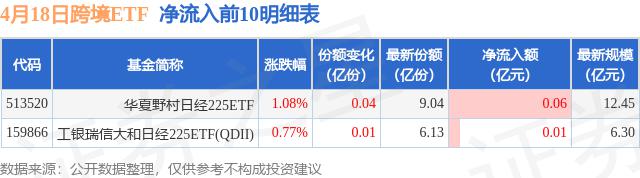 当天有 2 只跨境 ETF 资金净流入出现在基金中,其中华夏野村日经流入排名第一。 增加了225ETF(513520)的份额 400.0 万份,净流入额为 558.09 万元。