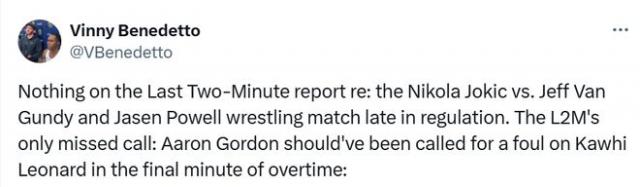 此外,掘金记者 Benedetto 在最后两分钟的裁判报告中,没有提到约基奇和范甘迪抢球,而且这一极具异议的回合,发生在裁判报告的评估范围内。