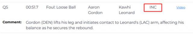裁判员报告说,在第四节的最后两分钟,没有任何错误和遗漏。唯一一次漏判出现在离加时赛结束之后。 51.7 几秒钟后,掘金队的戈登在莱昂纳德争夺篮板时,抬起双腿主动接触莱昂纳德的手臂,导致莱昂纳德身体失衡。快船遭受损失,掘金盈利,这是一次漏吹犯规。那时小卡一脸不满意,向裁判抱怨自己被犯规了,但是裁判没有理会,只是认定是小卡把球碰出了边界。