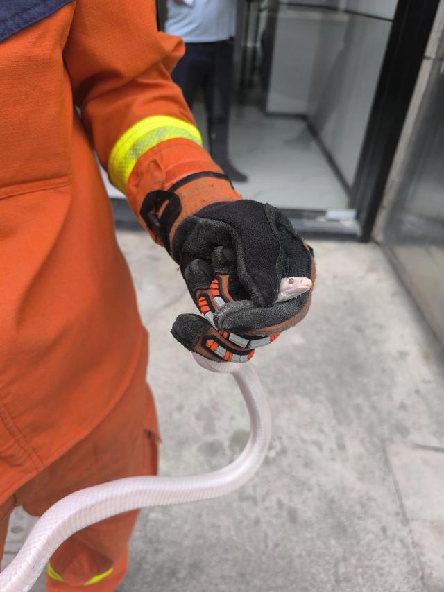 用专业的捕蛇器软软地兜住白蛇后,消防队员发现它的体形消瘦,腹部肋骨明显,推断已经好几天没吃东西了。