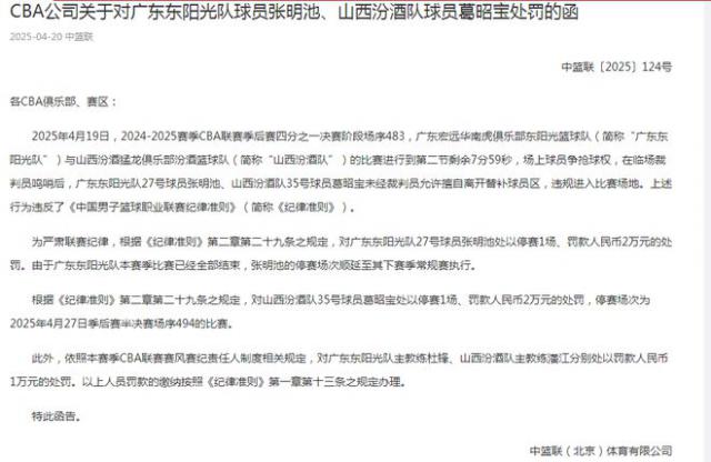 在山西总分 3-0 在广东晋级四强之后,狂扫广东,CBA 晋粤对决正式公布 G3 罚单,广东球员张明池和山西老将葛昭宝在场上发生冲突后,未经裁判允许擅自离开替补席,非法入场均被停赛。 1 场与罚款 2 两队主教练杜锋和潘江分别罚款一万元。 1 一万元,其中葛昭宝将无缘半决赛首场,本赛季山西罚款 42 广东罚款一万元 35 在联赛中,万元排名前两。