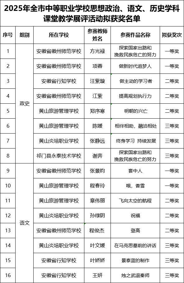 根据黄山市教育科学院《关于开展全市中等职业学校思想政治、语文、历史课堂教学展评活动的通知》(黄教研〔2025〕1号)经现场比赛和专家评审,现将公布获奖名单。公示期为:4月18日至4月25日。公示期间,如有异议,请向市教育科学院反映并提供书面材料。