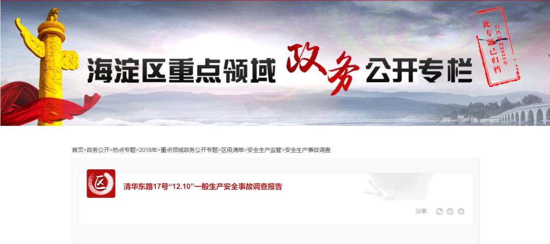 日前,北京市海淀区人民政府网站发布了《清华东路17号“12·10”一般生产安全事故调查报告》。经调查,发现事故是一起一般生产安全责任事故,是由从业人员违规行为和缺乏现场安全管理造成的。