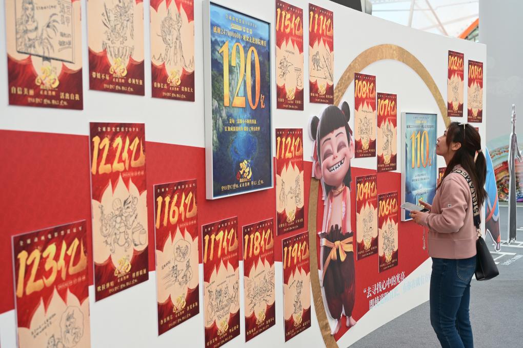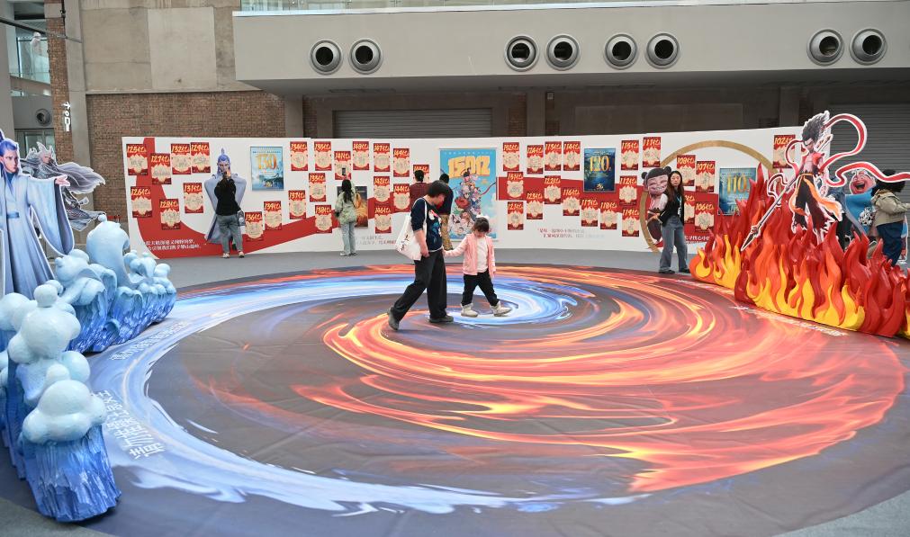 u2003u20034月19日,观众走过电影《哪吒的魔童闹海》手绘海报展示的衍化文化创意产品。新华社记者 李鑫 摄