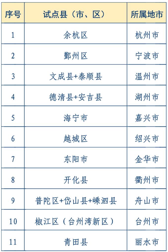 本次“先飞区”试点名单包括杭州市余杭区、宁波市嵊州区、温州市文成县 德清县,泰顺县,湖州市 安吉县、海宁市嘉兴市、越城区绍兴市、东阳市金华市、开化县衢州市、椒江区台州市 舟山市普陀区台州湾新区、丽水市青田县、 岱山县 嵊泗县。