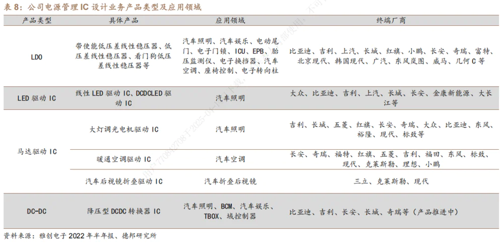 雅创电子于2022年以2.4亿元收购深圳欧创芯60%股份,以提高汽车芯片自主研发能力。欧创芯致力于模拟和数模混合和ic设计。其主要产品包括LED驱动IC,覆盖中低压场景,支持汽车灯后装市场和智能照明。DC-DC电源管理芯片具有高恒流精度和宽电压输入范围:包括降压/变压恒压驱动器,输入电压最高为150V,适用于电动汽车控制器、车载系统等大功率场景。