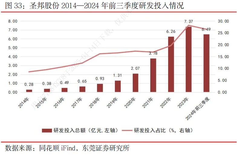 圣邦股份重视R&D驱动内生发展。公司自成立以来,R&D投资规模不断增加,R&D投资总额从 2014 年 0.28 亿元上升至 2023 年 7.37 R&D投资占1亿元,从 8.58%提升至 28.18%,2024 年前三季度,公司R&D投资达到 4.18 亿元,远高于行业平均水平,R&D投资占营收的比例是 26.54%。截至 2024 年中报告,公司共有R&D人员。 1085 人类,占员工总数的比例是 73.06%。