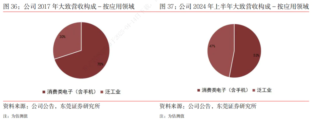 预计公司附加值较高的泛工业业务比例将继续增加,商品将逐步扩展到工业、汽车等泛工业领域。2017年 2008年上市之初,公司下游应用领域以消费类电子为主,占比约。 60%-70%, 至 2024 2008年上半年,公司消费类电子(包括手机)比例下降至 在工业、汽车等泛工业领域,53%的业务收入占比将提高到 47%。