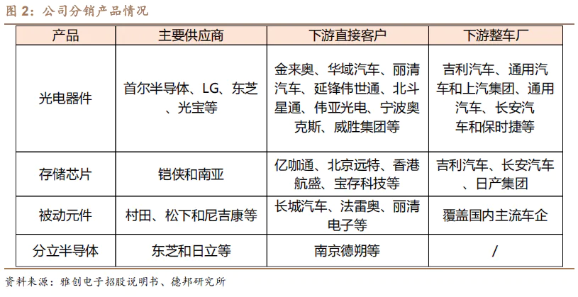 产品主要用于汽车电子领域,包括光电设备、存储芯片、被动元件和分立半导体。公司为用户提供包括供应链服务和技术服务在内的产品解决方案,实现商品销售。主要客户包括国内外汽车电子零部件制造商,如延锋伟世通、亿咖通、金来奥、法雷奥和现代摩比斯。