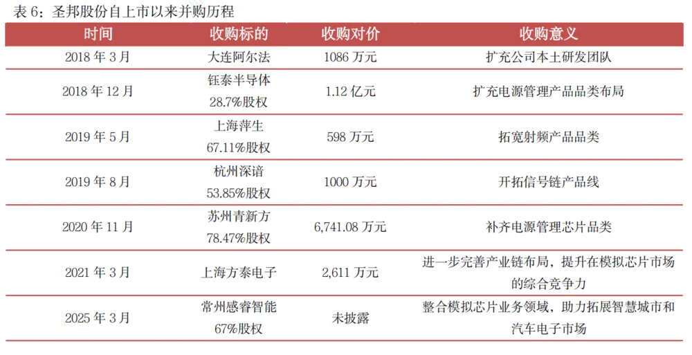 自2017年圣邦股份上市以来,通过“对外并购” 内部R&D“双轮驱动战略,不断扩大模拟芯片领域的布局,形成覆盖电池管理、信号链、射频等多种产品矩阵。2018年,并购大连阿尔法,扩大当地R&D部门;收购钰泰半导体部分股权,扩大电池管理产品类别。2019年,收购上海萍生微电子67.11%股份,拓宽射频产品类别;获得杭州深知53.85%股份,开拓信号链产品线。苏州青新方2020年收购78.47%股份,补充电源管理芯片类别。上海方泰电子资产组于2021年收购。2025年,常州感智能控股,汽车电子领域布局。在政策层面,“科八条”明确支持硬科技企业并购重组,为企业扩张提供政策东风。