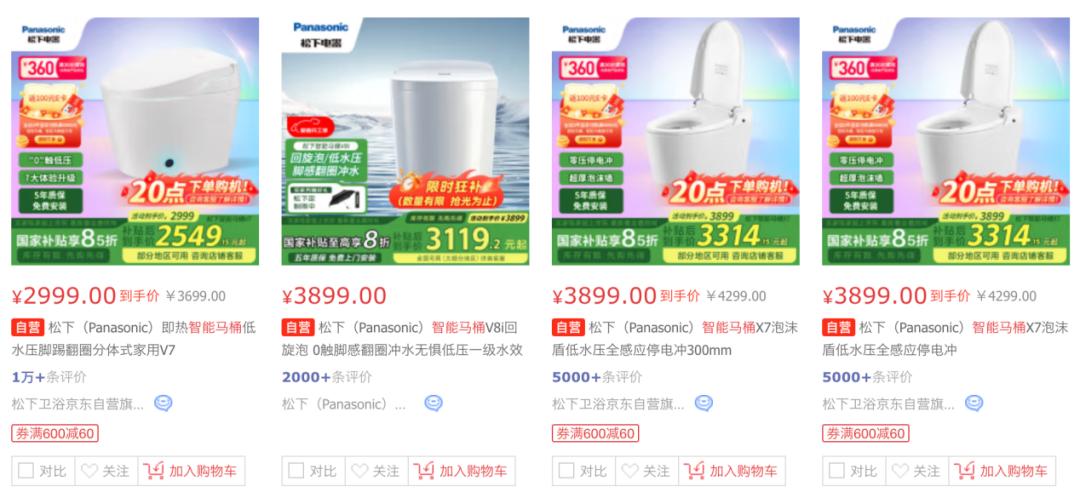 此外,国家补充政策也是推动智能马桶普及的一大推动力。以家电线上主渠道JD.COM为例。在享受国家补充的同时,松下智能马桶原价3699元的智能马桶V7只需要2549元,显然可以直接转化为大量观望客户。
