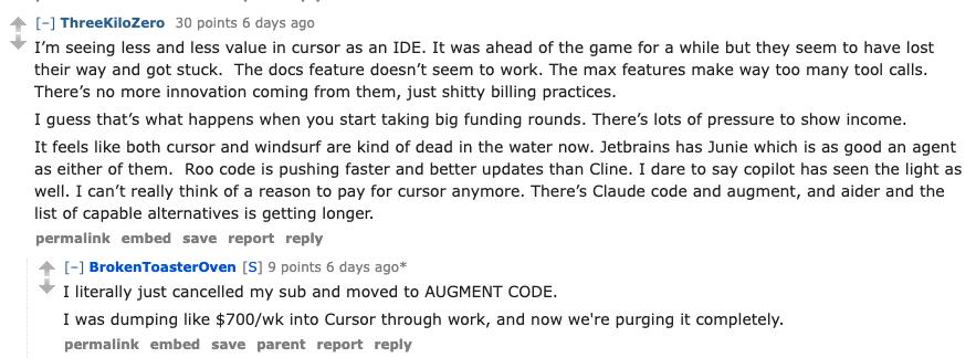 现在感觉 Cursor 和 Windsurf 都快凉了。JetBrains 推出的 Junie,智能化程度与它们相似,甚至更稳定。Roo Code 更新又快又猛,已经甩掉了。 Cline。甚至我都想说,Copilot 如今也变得聪明了许多。说实话,我真的想不出还有什么理由可以继续为之。 Cursor 花钱。Claude Code、Augment、Aider…可以玩的替代品只会越来越多。”