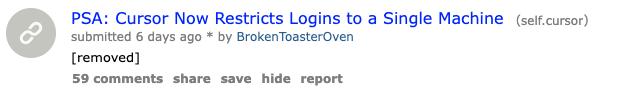 起初,他也不确定是否只有自己遇到过这样的情况,所以就在那里。 Reddit 上面发帖说:“只要登录一台设备就可以了。 Cursor,其它设备的登录将立即失效。这个客户体验简直是一大步。”(这篇文章之后, r/cursor 版主删除了。)