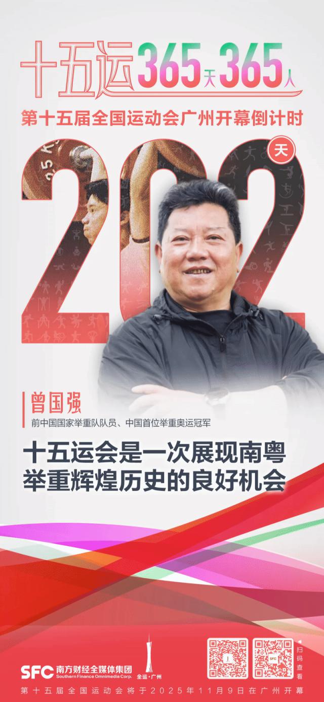 第十五届全国运动会将在 2025 年 11 月份在粤港澳三地举行。它是一项体育赛事,也是促进全民健身、促进体育事业高质量发展的重要机遇。在十五运会开幕倒计时一周年之际,南方财经全媒体集团与十五运会、残特奥会广州赛区执委会推出“十五运会” 365 天 365 “人”栏目聚焦选手、企业家、专家学者、体育爱好者、公众的全运故事和全运期待,让更多人了解和支持十五运,生动展现中国的体育精神、城市活力和文化魅力。