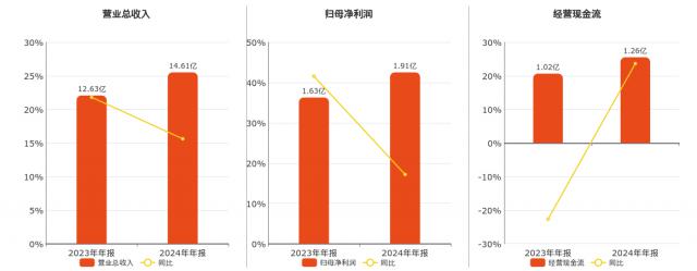 企业总营业收入为 14.61 亿元。归母净利润为 1.91 十亿元。经营活动现金净流入 1.26 亿元。