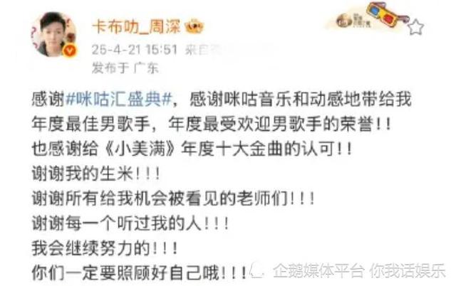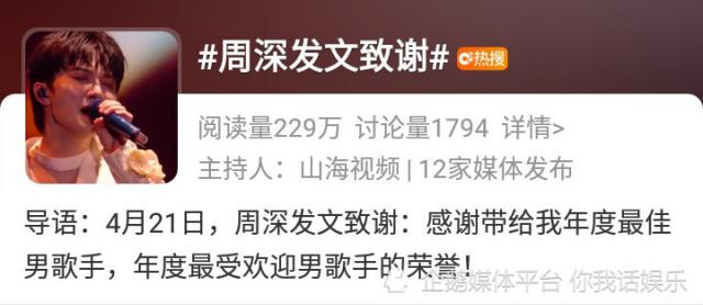 歌星周深传来一个好消息,他证明了自己! 4 月 21 这一天,周深在社交平台上发了一条信息,表达了深深的感谢。周深强调了一个美好的结果:感谢年度最佳男歌手和年度最受欢迎男歌手的荣誉!