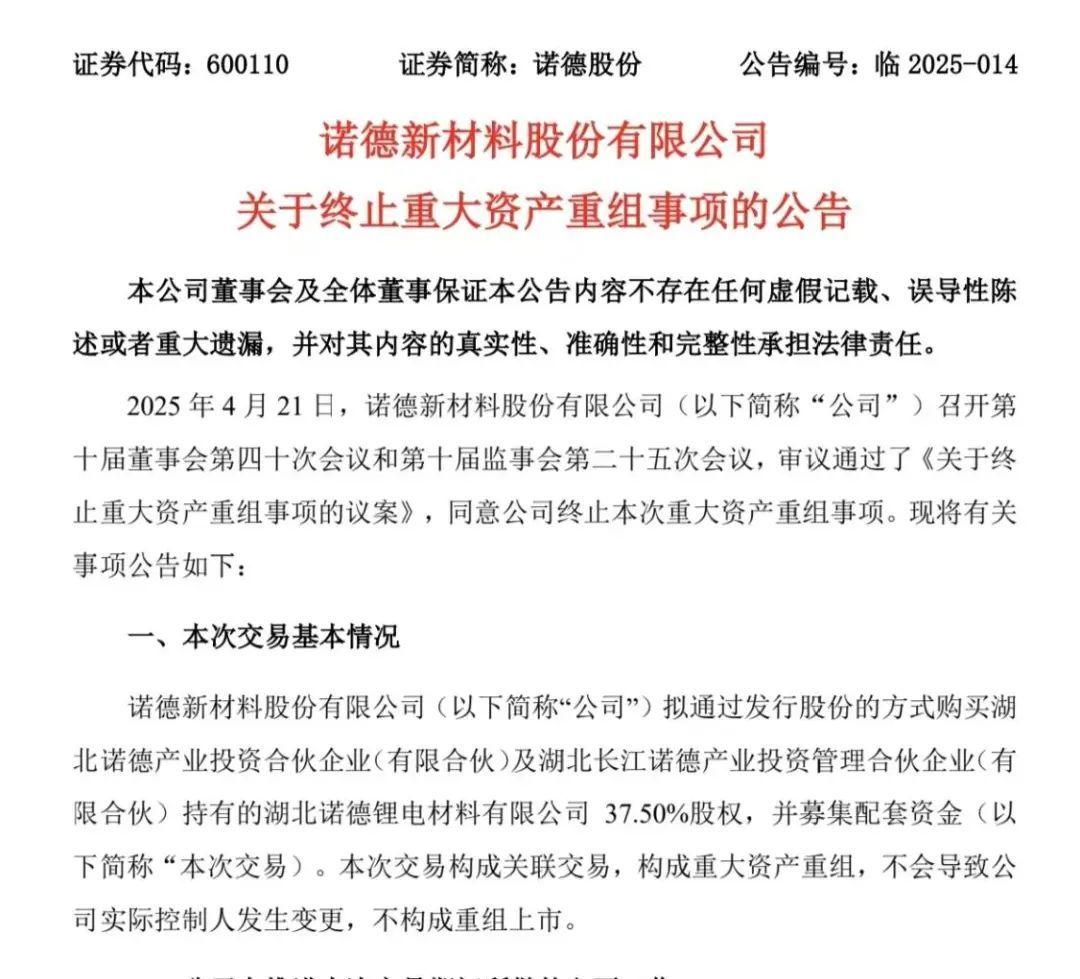 4月21日晚间, 诺德股权(股票号:600110)发布公告称, 企业决定终止之前筹备的重大资产重组事项。
