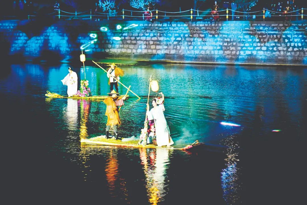晚上8点,桃河上出现了一个竹筏,暖黄色的灯笼吸引了观众的目光。身穿长袍的船工撑着竹筏向水中央驶去,女子在竹筏上吸水,浣纱...这一幕生活在水边的场景拉开了表演的序幕。