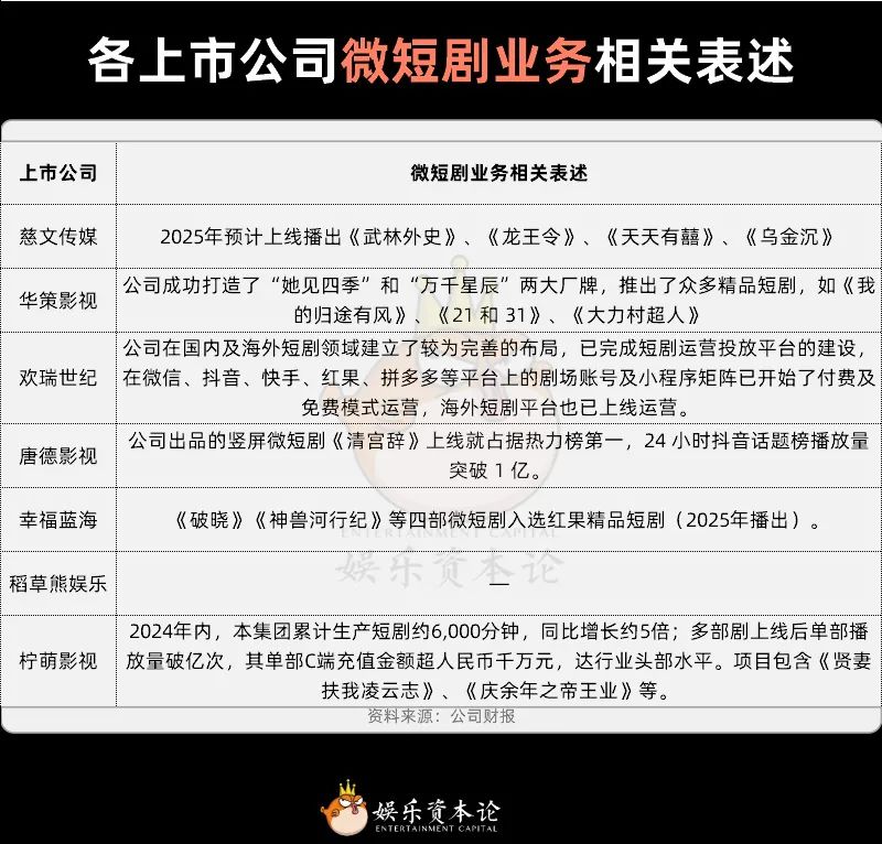 在微短剧赛道上,华策和柠萌是长剧公司的领头羊。2024年,前者推出了《我的归途有风》等头部短剧;柠萌赢得了很多IP庆余年,领先探索长 短暂的开发方法。慈文媒体和幸福蓝海的微短剧探索略显滞后。,年度报告的表述主要是2025年待播剧。