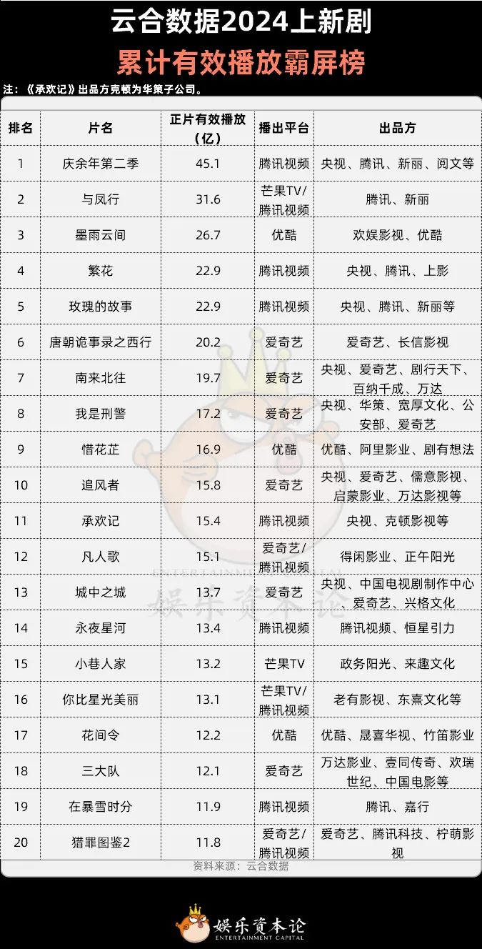 图5 云合数据2024上新剧累计有效播放霸屏榜,信息来源:云合数据,注:《承欢记》生产方克顿为华策分公司。