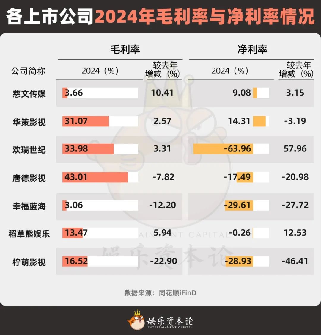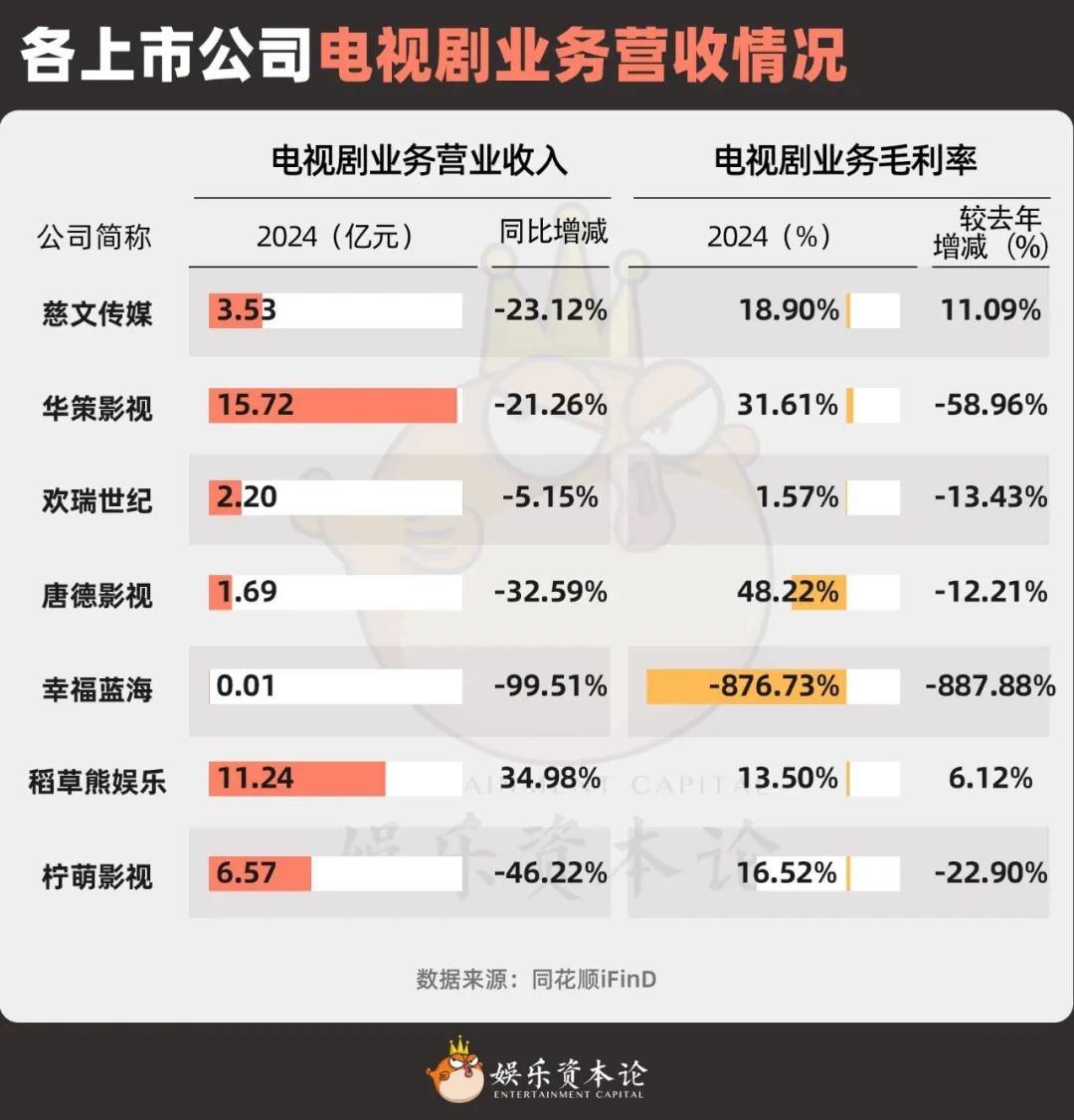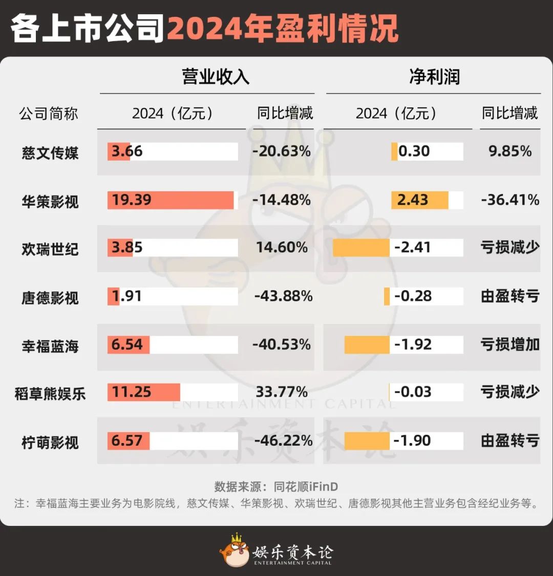 图1 2024年各上市公司盈利情况,信息来源:同花顺iFIND。注:幸福蓝海的主营业务是电影院,包括经纪业务在内的慈文传媒、华策影视、欢瑞世纪、唐德影视等主营业务。