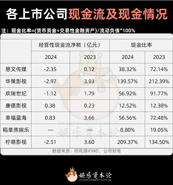 从现金储备来看,华策和柠萌处于第一梯队,慈文传媒、欢瑞世纪、幸福蓝海略逊一筹,稻草熊娱乐和唐德影视相对落后。但是,除唐德影视和柠萌影视外,2024年大部分上市公司的现金比例都严重缩水。