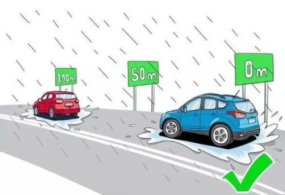 雨天路面光滑,刹车距离变长。为了避免前方发生紧急情况,可以适当扩大与前方车辆的安全距离,为自己预留足够的空间,采取紧急措施。同时远离大车的视觉盲点,与大卡车保持2m以上的距离,尽量避免与大车并行或跟随,避免大车溅起的雨水影响行车视线。