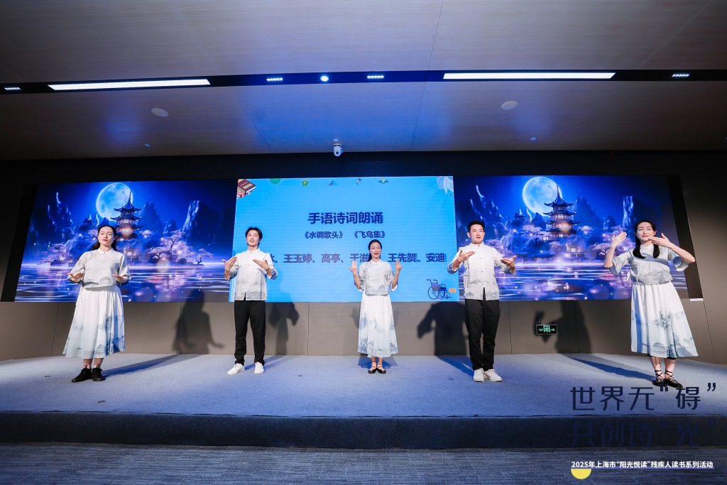现场,四肢残疾人、书法家沈杰、视障朗读者王林、上海图书馆谢文绮合作完成了《墨韵弦歌-风波》的结合表演,笔墨与韵味交融,诠释了“不听林打叶声”的豁达。听障艺术家单仁冰、王玉婷等。用手语表演了《水调歌头》和泰戈尔的《鸟集》,他们的肢体语言赋予了经典和新的活力。