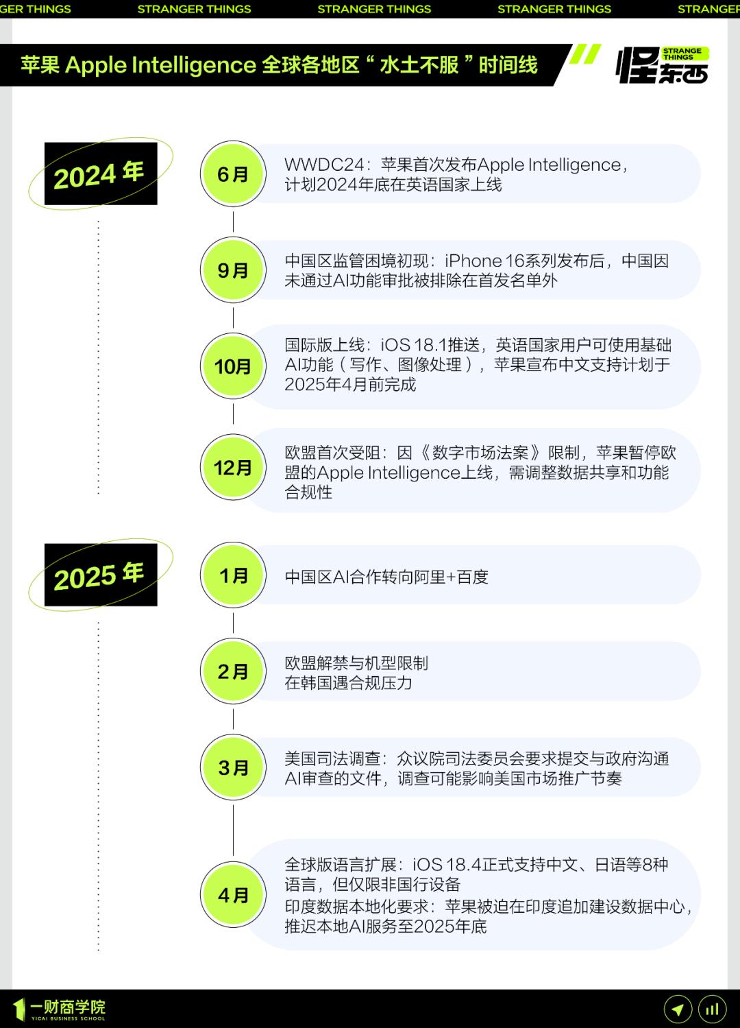 另一方面,Apple 由于AI监管政策的不同,Intelligence在全球范围内的落地也频繁受阻。