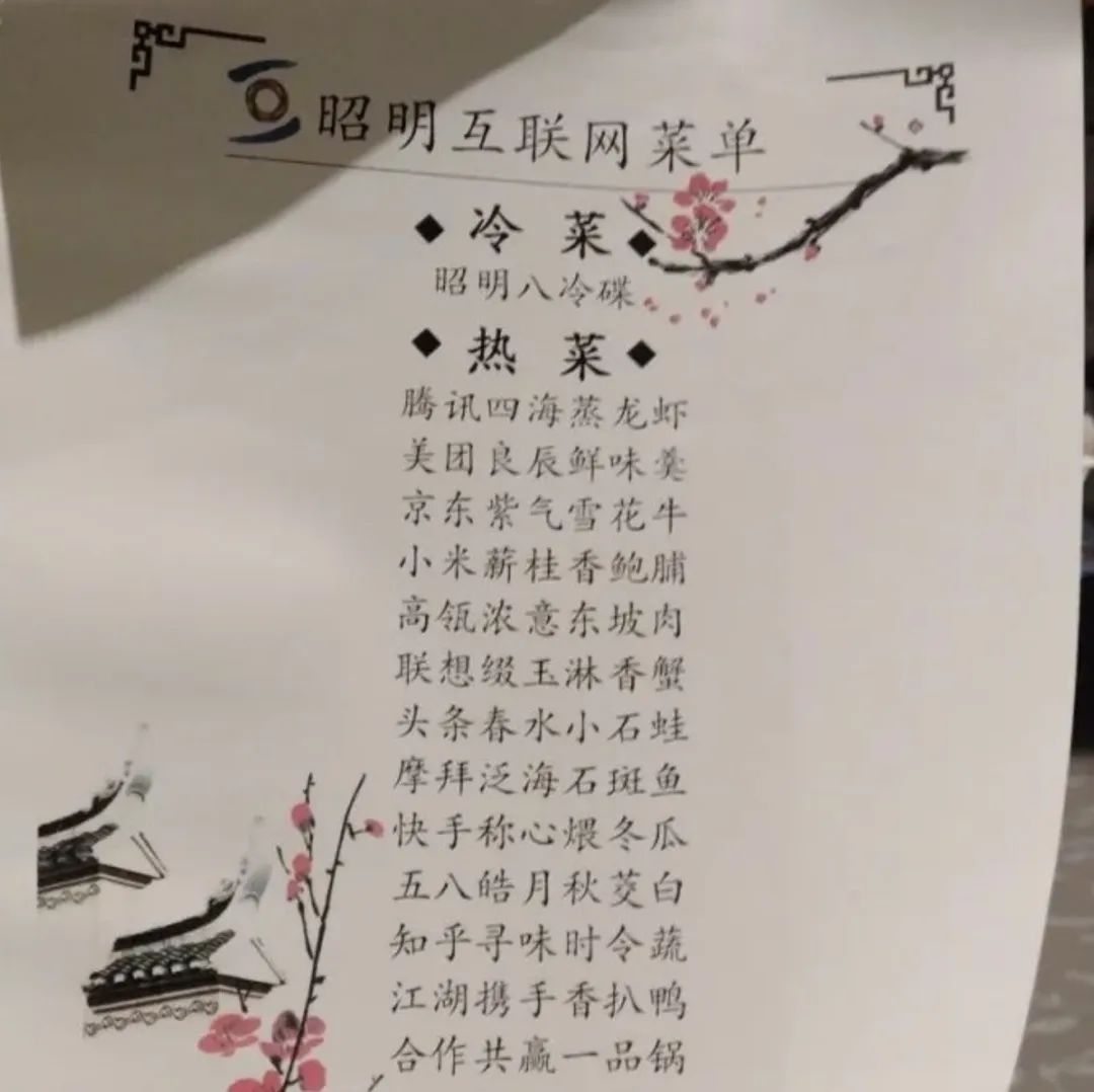 但是“东兴晚餐”上的联盟关系比较薄弱。起初,组织晚宴的“东兴”巧妙地将这位企业家的公司名称融入到菜肴中,制定了“昭明互联网菜单”,如美团的美味新鲜汤、JD.COM紫雪花牛、头条春水小石蛙等。,但“碰巧”错过了滴滴的菜肴。