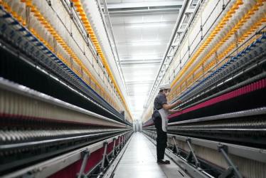 四月五日,工人们在江苏泰达纺织科技有限公司智能纺纱厂工作。新华社记者 季春鹏 摄
