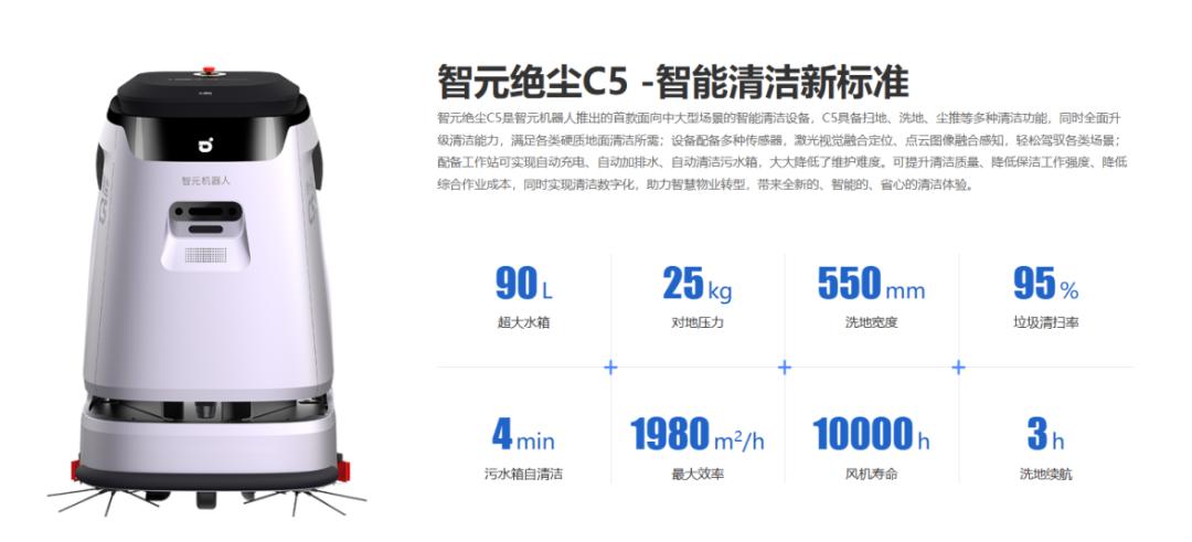 智元绝尘C5是智元机器人推出的首款面向智元的机器人。 智能清洁设备中大型场景 ,C5具有扫地、洗地、粉尘推送等多种清洁功能,同时提升了全新的清洁能力,满足了各种硬地板的清洁需求;配备各种传感器,激光视觉融合定位,点云图像融合感知,轻松控制各种场景;配置工作站可实现自动充电、自动排水、污水箱自动清洗。维修难度大大降低。