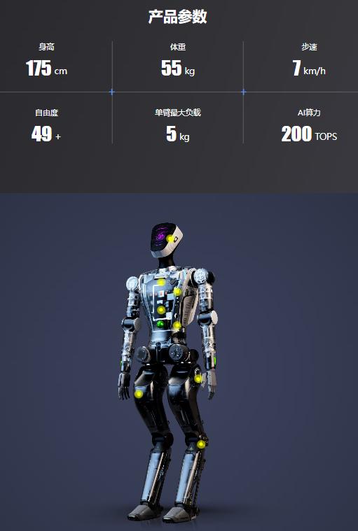 第一代智元通用型具身服务机器人,身高175cm,自由度49,步行速度7km/h,单臂负荷5kg。自主研究PowerFlow关节模块和准直驱关节方案,实现高动态运动控制,看准。 工业场景,如汽车制造,3C电子。