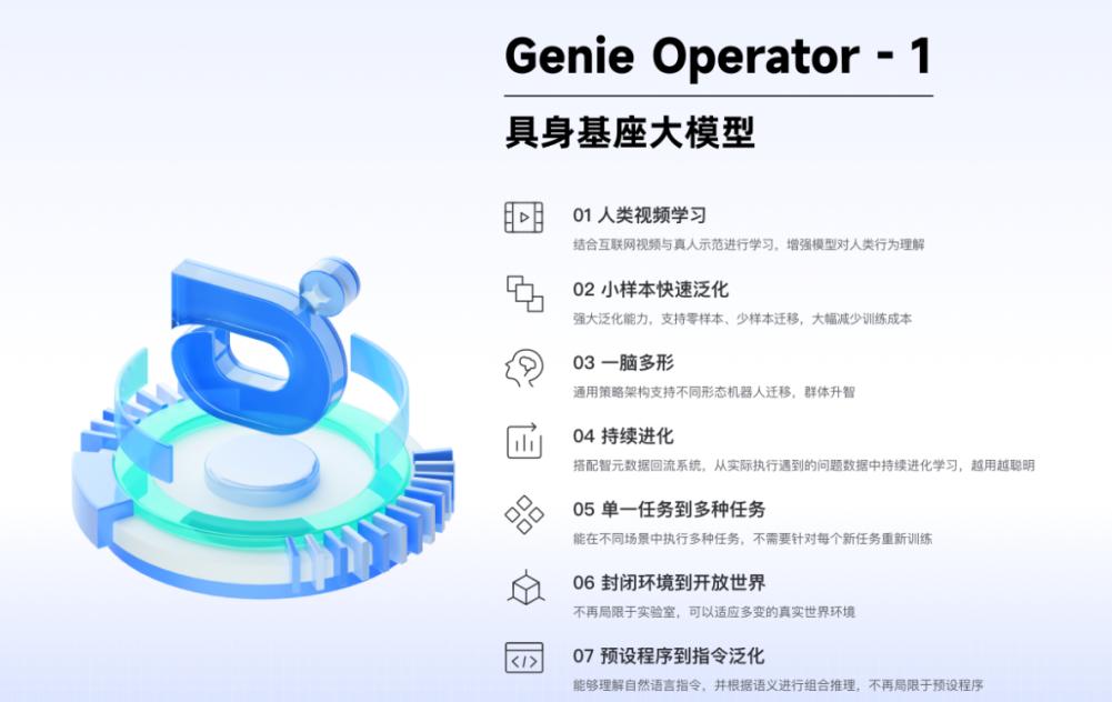 (1)启元大模型 (GenieOperator-1):第一个通用身体底座模型支持跨场景技能转移,可以借助人类视频学习快速泛化小样本,降低身体智能门槛,成功部署到智元多机器人本体,不断进化,将身体智能推向新的水平。
